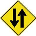 Two-Way Traffic Ahead The one-way street or roadway ahead ends. You will then be facing oncoming traffic. |